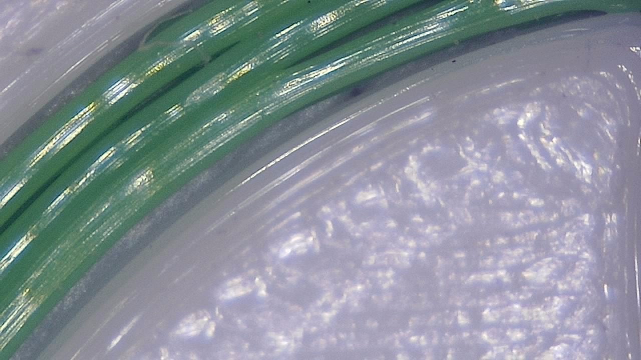 Close-up microscope image showing 3D print strand lines and surface behavior