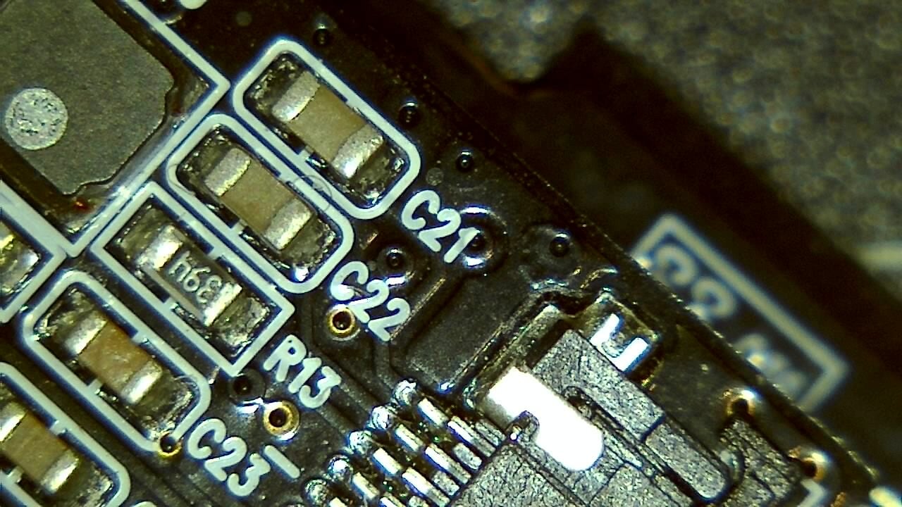 Sample PCB microscope image showing soldered components and labeled pads