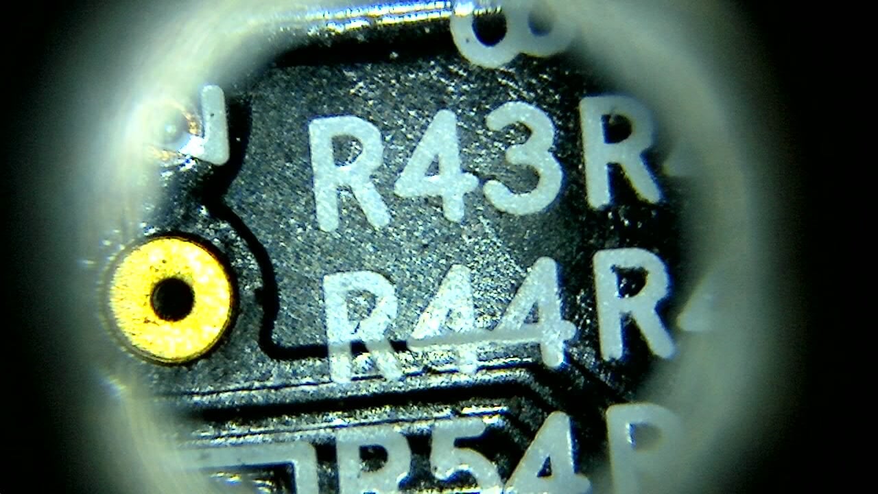 Close-up PCB microscope image showing resistor labels and pad detail